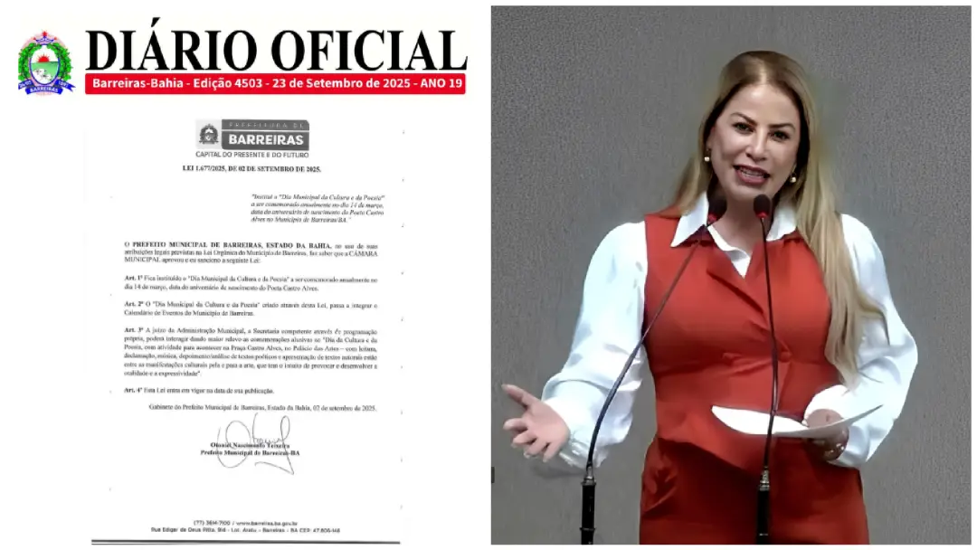 Barreiras passa a ter uma data oficial dedicada valorizao da arte. O Projeto de Lei n 072/2025, de autoria da vereadora Delmah Pedra, foi sancionada pelo executivo municipal e transformado na Lei n 1.677/2025, que institui o ?Dia Municipal da Cultura e da Poesia?. A celebrao ser realizada anualmente em 14 de maro, dia do nascimento do poeta Castro Alves, um dos maiores nomes da literatura brasileira.