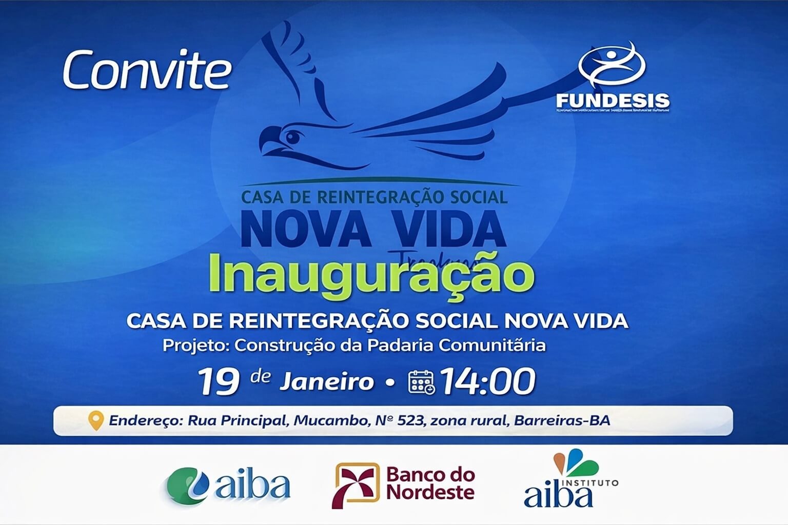 No dia 19 de janeiro, às 14h, será realizada a inauguração do Projeto da Padaria Comunitária da Casa de Reintegração Social Nova Vida, localizada na Rua Principal, Mucambo, nº 523 ? zona rural de Barreiras-BA. ??